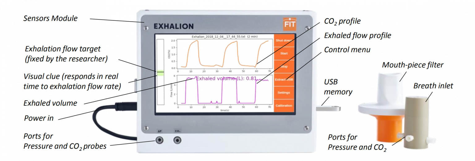 EXHALION comprises an autoclavable Breath Inlet, and a Sensors Module that houses the touchscreen and all electronics. The Breath Inlet is compatible with medical grade disposable spirometry mouth-piece filters, and SUPER SESI. The Sensor Module can be seamlessly attached to the MS.