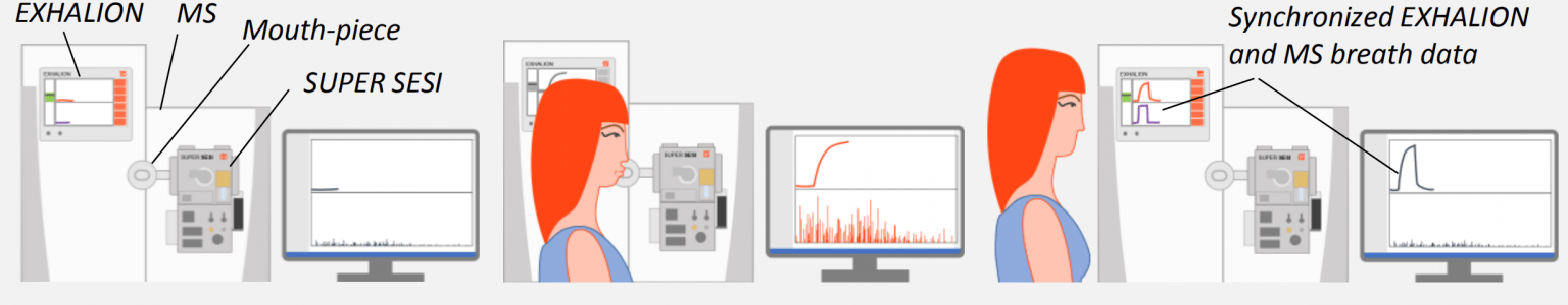 EXHALION is designed to facilitate Standard Operational Procedures for online breath analysis with SUPER SESI- HRMS. The dynamics of the lung, and its impact on the emission of different species, is extremely complex, and not known in detail. It is a consensus among the scientific breath research community, that standardizing the exhalation conditions is an essential step to eliminate sources of potential confounding factors. EXHALION links the new MS data with the well-established capnography knowledge. For instance, the CO2 profile allows distinguishing different lung fractions and their metabolites.